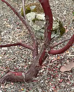 It is an erect shrub, reaching up to 2.5 meters in height. It has shreddy red bark that grows gray with age. It has smooth oval-shaped pointed leaves and dense inflorescences of flowers. The tightly bunched flowers are pale pink highlighted with bright magenta. The fruit is a red drupe between one half and one centimeter wide.