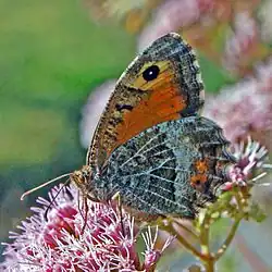 S. arethusa Esp. (43b, c). Above dark brown, with a yellow distal band, which is usually separated into spots in the male, and paler and broader in the female, the apical ocellus being without pupil and the fringes chequered grey and brown. The forewing is yellow beneath, the margin being marmorated with grey like the hindwing. which latter has a dark, in the male sinuous, median line, on the outside of which there is a pale band irrorated with white-grey. The distal band of the upperside varies enormously: it may be broad and continuous, or completely absent from the hindwing and vestigial on the forewing. — In ab. erythia Hbn., from South France and the East, the distal band is slightly dentate, the spots being acuminate: — in ab. dentata. which is the usual form at the Riviera, the spots are evenly and more strongly acuminate, the band therefore resembling a saw. — In boabdil Rbr. (43c) the band, above, is so shaded with smoke colour as to resemble the ground and almost to disappear in the same, only the apical ocellus with very feeble vestiges of the band being more distinct; Spain. — As obscura (43c) Ribbe sent me specimens from Andalusia which are quite black above and very vividly marmorated beneath. — Larva bone-colour, with a red-yellow dorsal-stripe in which there is a thin dark line, a yellow side-stripe and feeble, hardly visible, longitudinal hues; till June on Festuca. The butterflies from July till September, the various forms in some places flying together, being separated in other districts, common on lime-stone mountains, in the whole of South Europe, from Portugal to Turkey and South Russia, everywhere at the Black Sea, eastwards to Saisan in the Altai (Rueckbeil). In Europe the species extends northwards as far as Alsatia, Baden, Hungary (ab. peszerensis) and Galizia. The flight-places are often very distant from one another, being sterile hills and fallow-fields, especially on lime-stone.[6]