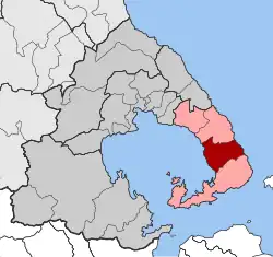 Argalasti (Greek: Αργαλαστή) is a village and a former municipality in Magnesia, Thessaly, Greece. Since the 2011 local government reform it is part of the municipality South Pelion, of which it is the seat and a municipal unit.[2] The municipal unit has an area of 74.820 km2.[3] It is built on a fertile plateau, 40 km southeast of Volos. It is an important commercial and tourism center of the area with a rich cultural tradition. Argalasti is a stopping point for those headed for the nearby beaches of the Pagasetic Gulf (Chorto, Kalamos, Lefokastro) or the Aegean Sea (Potistika, Melani, Paltsi, Mikro). An example of the architecture of the beginning of the 20th century is the church tower of Sts. Apostles.