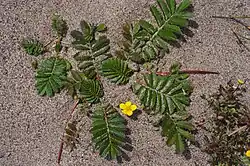 Eged's silverweed is a low-growing herbaceous plant with creeping red stolons up to 80 centimetres (31 in) long. The leaves are 10–40 cm (4–15+1⁄2 in) long, evenly pinnate into in crenate leaflets 3–5 cm (1+1⁄4–2 in) long and 2 cm broad, thinly covered with a few silky white trichomes (called hairs). The sparsity of the hairs is a useful distinction from A. anserina, which is more densely hairy.