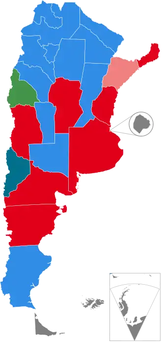 | Elected: 22 provincial governors, 24 legislative bodies Presidential appointment: Mayor of the City of Buenos Aires and Territorial Governor of Tierra del Fuego | ||||