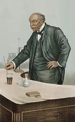 Argon was first isolated from air in 1894 by Lord Rayleigh and Sir William Ramsay at University College London by removing oxygen, carbon dioxide, water, and nitrogen from a sample of clean air.[19] They first accomplished this by replicating an experiment of Henry Cavendish's. They trapped a mixture of atmospheric air with additional oxygen in a test-tube (A) upside-down over a large quantity of dilute alkali solution (B), which in Cavendish's original experiment was potassium hydroxide,[18] and conveyed a current through wires insulated by U-shaped glass tubes (CC) which sealed around the platinum wire electrodes, leaving the ends of the wires (DD) exposed to the gas and insulated from the alkali solution. The arc was powered by a battery of five Grove cells and a Ruhmkorff coil of medium size. The alkali absorbed the oxides of nitrogen produced by the arc and also carbon dioxide. They operated the arc until no more reduction of volume of the gas could be seen for at least an hour or two and the spectral lines of nitrogen disappeared when the gas was examined. The remaining oxygen was reacted with alkaline pyrogallate to leave behind an apparently non-reactive gas which they called argon.