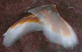 Female argonauts produce a laterally compressed calcareous eggcase in which they reside. This "shell" has a double keel fringed by two rows of alternating tubercles. The sides are ribbed with the centre either flat or having winged protrusions. The eggcase curiously resembles the shells of extinct ammonites. It is secreted by the tips of the female's two greatly expanded dorsal tentacles (third left arms) before egg laying. After she deposits her eggs in the floating eggcase, the female takes shelter in it, often retaining the male's detached hectocotylus. She is usually found with her head and tentacles protruding from the opening, but she retreats deeper inside if disturbed. These ornate curved white eggcases are occasionally found floating on the sea, sometimes with the female argonaut clinging to it. It is not made of aragonite as most other shells are, but of calcite, with a three-layered structure[6] and a higher proportion of magnesium carbonate (7%) than other cephalopod shells.[7]