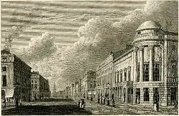 In 1818, Slade was forced to sell by the Regent Street commissioners. Slade was awarded by a jury £23,000 as compensation (a sum considered high at the time), and the whole of the old building was removed and new rooms erected, on the east side of Regent Street at the north-west corner of Argyll Place. The new building was designed by Nash: on the side next Regent Street was a balcony supported by eight caryatids. The group by whom it was erected were 21 of the prominent London musicians in London, who had formed the Regent’s Harmonic Institution to publish music. This organisation occupied, for the purposes of its trade, the southwestern angle of the new building (at the corner of Regent Street and Argyll Place), circular with a domed roof. The cost of the building, with other factors, soon led to the withdrawal of most of the original investors, at a loss of about £1800 each, and the place eventually fell into the hands of two of them, Thomas Welsh and William Hawes. They then fell out, and ultimately Hawes, by an act of bankruptcy, forced a dissolution of the partnership, and the concern then remained in the hands of Welsh alone.