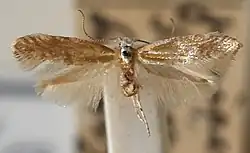The wingspan is 7–9 mm. The head is white. Forewings are violet-whitish, suffusedly mixed and irrorated with brownish golden; a transverse oblique mark from middle of dorsum, a small spot on middle of costa and another beyond it usually darker golden-brown; some small darker spots towards apex. Hindwings are pale grey.[2][3]