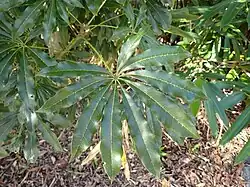 Argyrodendron actinophyllum, commonly known as black booyong, black jack, stave wood, Mackay tulip oak, crowsfoot elm, booyong, tulip oak or blush tulip oak,[2] is a species of flowering plant in the family Malvaceae and is endemic to eastern Australia. It is a large tree with prominent buttress roots, palmately compound leaves with 5 to 9 lance-shaped leaflets, flower arranged in panicles, and winged samaras.