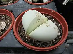These distinctive plants are among those known as "living stones", because their highly succulent, usually stemless, blue-green leaves occur at ground level and can resemble small stones. They form small clumps of a few or many paired, usually cylindrical to egg-shaped leaves that are cleft in the center. Each stem bears just 2 leaves per season but may produce offsets over the years. In some species the old leaves persist and form a short column on which new leaves develop. Solitary daisy-like flowers, usually white, yellow, or purple, appear in the cleft.[2]