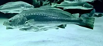 Argyrosomus japonicus is a silvery to bronze-green colored saltwater fish of the family Sciaenidae, which may grow up to 2 m (6 ft 7 in) in length and weigh up to 82 kg (181 lb).[2][3][4] It is known as Dusky Kob, dusky salmon, salmon, Kob and kabeljou' in South Africa, Japanese meagre (FAO),[2] mulloway or jewfish in the eastern states of Australia and South Australia,[5] kingfish or river kingfish in Western Australia,[6] Ô-nibe (大鮸, オオニベ) in Japan, and Sawwa Krokar Fish or Sawwa Machli in Pakistan. The name jewfish refers to its large otoliths, which are prized as "jewels" by some fishermen.[3]