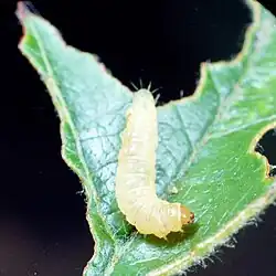 Neonatal larvae are not thought to naturally commit egg cannibalism. However Rock 1968 was able to induce it in laboratory conditions.[4] They go on to feed on various plants, including the leaves and fruit of apple and other fruit trees, as well as spruce and various vegetables.