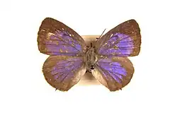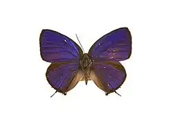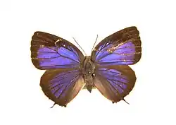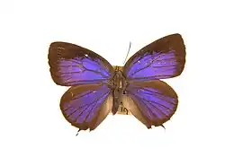 Arhopala is a very large genus of gossamer-winged butterflies (Lycaenidae). They are the type genus of the tribe Arhopalini. In the relatively wide circumscription used here, it contains over 200 species collectively known as oakblues. They occur from Japan throughout temperate to tropical Asia south and east of the Himalayas to Australia and the Solomon Islands of Melanesia. Like many of their relatives, their caterpillars are attended and protected by ants (myrmecophily). Sexual dichromatism is often prominent in adult oakblues.[1]