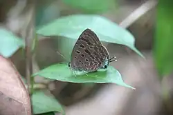 The upper side is glazed purple, the black border is narrower, and the wings are more pointed than most of the Arhopala butterflies.[2][3] Its wingspan is 35-38 mm.[4]