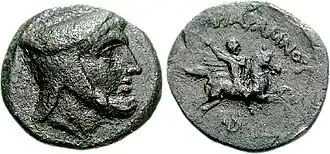 Ariaramnes' name is the Greek attestation of an Old Iranian name, AryΔrΔman ("he who brings peace to the Aryans").[1] His name is sometimes confused with an akin name, Ariamnes.[1] Ariaramnes minted coins during his reign. On the obverse of his coins, he is portrayed wearing the Persian satrapal tiara, whilst the reverse shows him holding a lance whilst riding a horse.[1][2]