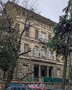 Built in 1903, its architect was an Ottoman Greek C. Pappa.[1] The building is situated within a large garden surrounded with a 3 m (9.8 ft)-high masonry stone wall.Entrance to the premises was originally through two iron gates, one of which was for service. During the construction of the tram line in the street in the 1930s, the street-side garden wall was retracted, and the main gate removed. The masonry stone mansion consists of a basement, ground floor, three floors and attic. It was designed as an apartment building for the Sarıca Family members. The monumental entrance featuring four marble columns with Ionic capitals is reached from the street by a crescent-shaoed mosaic-paved and marble-walled walkway. The diverse typed cornices balances the vertical effect on the façadee of the building. The windows are covered with white-painted horizontal wooden slat blinds of so-called "Istanbul-type", which can be lowered and drawn. The floors are separated with big double-wing doors in front of the staircaeses. As common in mansions and waterfront residences of the era, the rooms on each floor open to a hall in the center.[1]