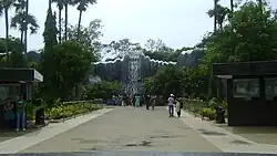 The main entrance of the park is located towards the south west along the Grand Southern Trunk Road. The entire campus is enclosed by a compound wall.[27][30] Close to the entrance, there is a children's park on one side and lawns on the other side. The enclosure of water fowl is located close to the children's park next to the primate section, followed by the terrestrial birds. A circular pathway takes the visitors to the interior of the park around the hillock. The enclosures for the carnivores are situated on the top of the hill with the herbivore exhibits along the slopes. Lower down the road are two smaller loop sections with one consisting of the bear enclosures and the other accommodating the walk-through aviary. The bear section leads to the lion safari at the north east corner of the zoo.[31]