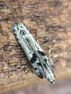 The wingspan is about 17 mm. The forewings are whitish, irregularly irrorated (sprinkled) with light grey and with a grey suffusion along the inner margin from the base to the anal angle. There is a small blackish spot on the costa almost at the base and a black dot beneath the costa at one-fifth, and a second larger one beneath it on the fold. A thick blackish transverse somewhat oblique streak is found at one-third, reaching from beneath the costa to the fold, the margins irregular. There are also two black dots nearly longitudinally placed in the middle of the disc, and a third in the disc at three-fourths. The hindwings are grey.[3]