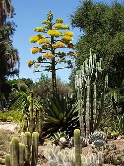 Plants known to be in the garden in 2016 include torch lily, century plant, golden barrel cactus, cholla cactus, Mojave yucca, Yucca filifera,[7] Yucca schottii,[8] Peruvian apple cactus, soap aloe, flat-flowered aloe, Boojum tree, aeonium, Ponytail palm and Italian cypress.[9][10][11]