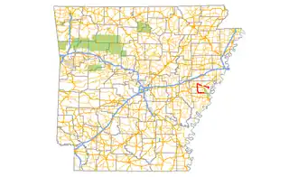 Arkansas Highway 121 (AR 121, Hwy. 121) is a designation for two state highways in Lee County, Arkansas. One route of 9.49 miles (15.27 km) runs from the St. Francis River to US Route 79 (US 79) northeast of Marianna.[2] A second routing begins north of Marianna at Highway 1 and runs essentially in a half-loop counterclockwise to LaGrange.[a 1]