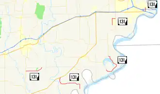 Highway 131 (AR 131, Ark. 131, and Hwy. 131) is a designation for five north–south state highways in northeast Arkansas. One route of 5.51 miles (8.87 km) runs from Highway 1 in Haynes east to Lee County Road 719.[2] A second route of 9.57 miles (15.40 km) begins at US Route 79 (US 79) near Brickeys and runs south[a 1] to the Mississippi River levee.[2] A third route of 8.74 miles (14.07 km) forms a semicircle around Horseshoe Lake and Porter Lake, connecting to Highway 147 at both ends.[4] A fourth route of 3.11 miles (5.01 km) begins at Highway 147 and runs through Edmondson.[4] A fifth route begins at Interstate 55/US 61/US 64/US 79 (I-55/US 61/US 64/US 79) in West Memphis and runs north to Martin Luther King Jr. Drive/Mound City Road in West Memphis.[4] All routes are maintained by the Arkansas State Highway and Transportation Department (AHTD).