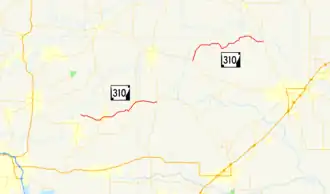 Highway 310 (AR 310, Ark. 310, and Hwy. 310) is a designation for two state highways in Central Arkansas. One route of 13.40 miles (21.57 km) begins at Highway 36 and runs east to Highway 16.[2] A second route of 11.01 miles (17.72 km) begins at Highway 5 and runs west to Faulkner County Route 310 (CR 310) Clinton Mountain Road west of Enola.[a][2][4] All routes are maintained by the Arkansas Department of Transportation (ArDOT).