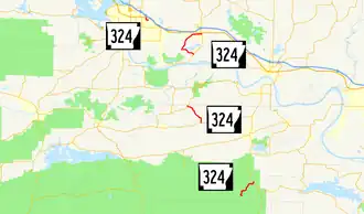 Highway 324 (AR 324, Ark. 324, and Hwy. 324) is a designation for four state highways in the Arkansas River Valley. One route of 0.76 miles (1.22 km) runs from US Highway 64 (US 64) to Tyler Road in Russellville.[2] A second route of 6.85 miles (11.02 km) begins at Highway 105 and runs east around Lake Atkins to terminate at Highway 105.[2] A third route of 4.01 miles (6.45 km) connects Highway 155 and Highway 10 in Perry County.[3] A fourth segment connects Lake Sylvia Recreational Area in the Ouachita National Forest to Highway 9 and the state highway system.[3] All routes are maintained by the Arkansas State Highway and Transportation Department (AHTD).