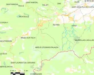 Amélie-les-Bains-Palalda is located in the canton of Le Canigou and in the arrondissement of Céret. It sits at the confluence of the Mondony with the Tech, 28.5 miles (46 km) SSW of Perpignan by road. The town is situated at a height of 770 feet (230 m) and has both a winter and summer season.[4]