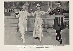 The magnificence of the mounting of Arlette at the Shaftesbury will set old playgoers thinking for all that it is called an "operetta," it is molded on traditional lines, and possesses sparkling music. The tale is of the impecunious Prince Paul of Perania (Mr. Joseph Coyne), who prefers Arlette, a modest attendant on the Queen Dowager (Miss Winifred Barnes), to all the vast wealth of Miss Walters from America (Miss Adrah Fair). There is here some sort of a likeness to The Merry Widow, which first introduced Mr. Joseph Coyne as a peerless prince. Paul of Perania (perennial it might almost be) is, however, much more of what we term a Bertrand Wallis part, and a lady has even to look at a photograph of the princeling and talk of his good looks. Mr. Coyne makes much fun of this incident, but somehow it doesn't assist the love interest.[2][12]