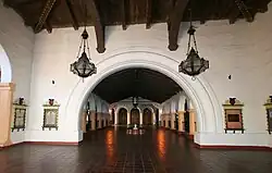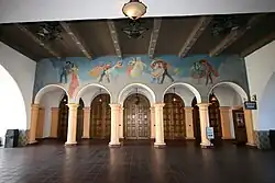 The interior is elaborately decorated. The lobby ceilings are heavily beamed and painted, and the auditorium, which seats 2,018 on its main floor and balcony, is designed to give theatergoers the impression that they are sitting in a colonial Spanish town's outdoor plaza. To create this effect, each auditorium wall features built out houses, staircases, and balconies, and the ceiling is designed to evoke the dark sky and stars.
