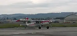 From the group for Armor Services (GRD) the flight test branch Emmen became the aviation branch of Armasuisse. The Pilatus PC-6 and PC-12 wear an emblem with a fictional experimental aircraft before Mount Pilatus. The Armasuisse regularly conducts test flights for the Swiss Air Force. The test pilots of Armasuisse are military pilots and all aircraft of the Air Force may be used by the Armasuisse. An F/A-18C is normally assigned to the Armasuisse for tasks such as certification of a new version of the AIM-9 missile, but this airplane is also used for normal Air Force duties. In addition, the Armasuisse has 3 permanently assigned aircraft which the Air Force uses when required: