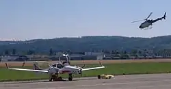 A Pilatus PC-6 Porter with a more modern cockpit than that of the PC-6T of the Air Force. This machine is used as liaison aircraft. The Pilatus PC-12 is used for transport and calibrates the FLORAKO radar system, the Multifunctional Information Distribution System(MIDS) Link 16 and aircraft radio systems. The Diamond DA42 Centaur OPA is flown both manned, or unmanned as a UAV. The Centaur system is produced by Aurora Flight Sciences of the USA, starting with a basic DA42 from Diamond Aircraft. The Centaur system is used to conduct experiments and test flights on integrating UAVs with manned military and civil aircraft operations. In addition, this airplane is also used for liaison flights.
