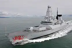 HMS Dragon (D35) is the fourth ship of the Type 45 or Daring-class air-defence destroyers built for the Royal Navy. She was launched in November 2008 and commissioned on 20 April 2012.[21] The warship is based in Portsmouth and also has affiliations with Cardiff, Wales.[22] The original red dragons on the bows of the ship were privately funded and were removed during a refit. An appeal by the ship to its supporters in Cardiff and the British Warships Association (BWA), headquartered in Wales, received immediate response and support, and the Welsh dragons were reintroduced to the bows of the ship.[23]