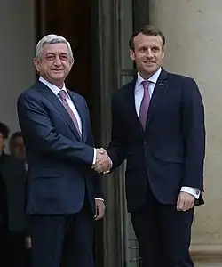 Diplomatic relations between Armenia and France were established on 24 February 1992. On 2 October 2009, Vigen Chitechian was appointed Ambassador Extraordinary and Plenipotentiary of Armenia to France.[4] On 5 November 2010, Henri Reynaud, Ambassador Extraordinary and Plenipotentiary of the French Republic to Armenia, presented his credentials to the President of Armenia, Serzh Sargsyan. Also on 1 December 2011 Vardan Sirmakes was appointed Consul General of Armenia in Marseille.[5]