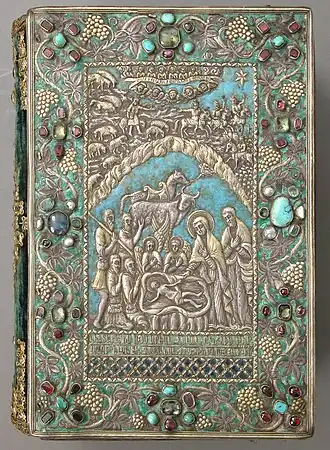 The gospel was created in two parts; the book itself dates to the 13th century, while the elaborate metalwork cover and accompanying adornments are attributable to the 17th century. The design used on the front plaque of the book, depicting the Nativity and the Adoration of the Shepherds , is directly inspired by the work of Dutch woodcutter Christoffel van Sichem . The metalwork itself was produced in Kayseri, Turkey .[ 1]
