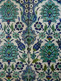Jerusalem's ancient Armenian community experienced a major increase in numbers as survivors of the Armenian genocide perpetrated by the government of the Ottoman Empire beginning in 1915 found refuge in Jerusalem's Armenian Quarter. The industry was started by David Ohannessian and other refugees from Kütahya, a city in western Anatolia noted for its Iznik pottery.[1] The tiles decorate many of the city's most notable buildings, including Ohannessian's tiles for the Rockefeller Museum, Mardigian Museum of Armenian Art and Culture, and American Colony Hotel, and the House of the President of Israel.[1]
