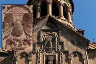 Armenian medieval sculptures are sculptures created in the medieval period. They are most present on or in churches, martyries, and free-standing monuments, such as four-sided stelae and khachkars (cross stones). The popularity of sculpture in the Armenian medieval art was due to midis- a three-layer layout of stones, when two rows of hewn stones were joined with lime mortar, and the surface got an artistic treatment.[1]