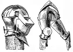 The classic armet had a narrow extension to the back of the skull reaching down to the nape of the neck, and the cheekpieces were hinged, horizontally, directly from the main part of the skull. From about 1515, the Germans produced a variant armet where the downward extension of the skull was made much wider, reaching as far forward as the ears. The cheekpieces on this type of helmet opened sideways, on vertical hinges on the edges of this wider neck element.[5] The high-quality English Greenwich armours often included this type of armet from c. 1525. Greenwich-made armets adopted the elegant two-piece visor found on contemporary close helmets; armets of this form were manufactured until as late as 1615. The lower edge of such helmets often closed over a flange in the upper edge of a gorget-piece. The helmet could then rotate without allowing a gap in the armour that a weapon point could enter.[6]