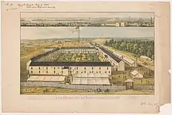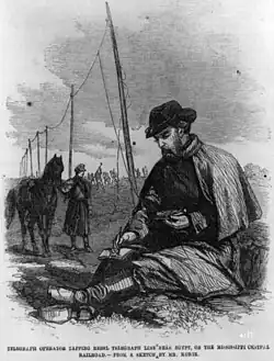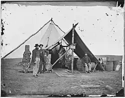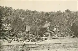 When on the defensive, the main line would be formed around a strong terrain feature (stone wall, embankment, etc.) or fieldworks, either of which ideally allowed for flanking fire. Supporting lines were placed behind the main line, on a hill overlooking it if possible but otherwise providing a ready reserve. Counter-battery fire would attempt to knock out the enemy's artillery while skirmishers harassed the attacker as they advanced. Once within range, the defending infantry attempted to drive off the enemy with superior firepower or, if timed right, a counter-charge of their own.[25] Fieldworks were used extensively during the Civil War. Even outside of sieges, both armies made every effort to construct whatever defensive fortifications that time permitted. Examples included rifle pits, abatises, wire obstacles, land mines, and palisades. Truly impressive trench systems were constructed, often thanks to the widespread use of Black laborers by both armies.[26]