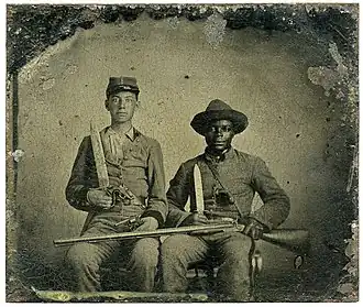 The North in particular tried various means to limit the effect of conscription on the populace. Bounties were paid out to those willing to join voluntarily, and various reenlistment bonuses were offered to keep veterans within the ranks. The Invalid Corps was created so that wounded soldiers filled out essential rear area duties, freeing the able-bodied for frontline duty.[6] Perhaps the most radical measure however was enlisting African Americans for service. The Militia Act of 1862 gave Lincoln the authority to do so, but it was only after the Emancipation Proclamation was any effort made. By May 1863 the Bureau of Colored Troops had been created to oversee the organization of Black soldiers as United States Colored Troops. In total, 178,000 African Americans fought in the Union army and another 10,000 in the navy.[7]