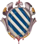 Coat of arms of the Duodo (16th century) The Duodo were one of the most ancient families in Venetia, with records dating back to 1043 when a Fantino Duodo served as Galley Captain in the fleet of Domenico Contarini during the conquest of Zara. The family's origins remain a subject of historical debate, with some sources tracing them to Morea, near the Gulf of Lodrino.[57][58] They secured a distinguished place among the Venetian nobles, gaining a seat at the Council of Ten and producing a long lineage of prominent figures. Among them was Nicolò Duodo, a senator and ambassador to various princes, active before 1350. Luca Duodo commanded the Venetian fleet with supreme authority in 1354, during the wars that defined La Serenissima's maritime dominance. Christoforo, after serving as a general on the Po River, was later rewarded with the high office of Porpora Procuratoria. As General of the Great Galleys at Curzolari, Francesco displayed extraordinary valor by disrupting enemy formations, breaking through their ranks and securing what became one of the most decisive victories for Christendom over its adversaries. In recognition of his achievements, his brother Domenico was honored as a senator, known for his unwavering integrity and wisdom. Pietro Duodo, a knight and ambassador, who in 1495 had led a squadron of Albanian cavalrymen at the Battle of Taro,[59] transformed his mountainous estate in Monselice into a place of worship, constructing seven finely adorned churches, one of which stood out in both grandeur and sanctity, enriched with relics of Holy Bodies and other sacred remains. In later generations, Girolamo Duodo represented Veneto as an ambassador at the Court of Spain, where his prudence and diplomatic skill strengthened the Republic's influence abroad. The Duodo family resided at Santa Maria Zobenigo. According to Gallicciolli, the palace suffered severe damage in the great fire of December 3, 1741.[60] Eventually, ownership passed on to the Barbarigo family. By 1808, the last family heir, Carlo, resided at Palazzo Duodo.