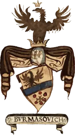 Coat of arms of the Burmazi (1700) The Burmazi (or Burmazorich) were a pastoral community that had settled in the Stolac region during the first half of the 14th century. Entrusted with garrison and policing duties, they were frequently involved in raiding and plundering. During Venetian rule, the Burmazi became an administrative unit encompassing Boka, Gripuli, Budua and Pastrovichi, with their seat in Cattaro. The earliest mention of the Burmazi appears in Ragusan archives (1300), identified by historian Konstantin Jireček, who linked their name to the Albanian term for “great man”. By 1343, they were engaged in trade, with Ottoman records listing them alongside the Mataruga tribe.[106] Some members of the family converted to Islam to safeguard their possessions, while others migrated to Dalmatia between the 16th and 18th centuries, settling in places such as Cursola, Spàlato, Castella, Sebenico and Ogòrie. Later Venetian and Austrian records confirm their continued presence, documenting landowners, judges and even an 18th-century folk poet named Ante Burmaz. In 1835, the Austrian cadastre recorded several Burmazi families in Upper Ogòrie and Niska, though by the 1948 census, their numbers had dwindled.[107]