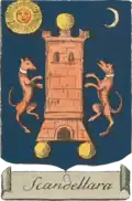 In contemporary Albanian history, this coat of arms is speculatively attributed to one Anton Skura, a supposed patriarch of the noble Scura family, which held sway over the territories in nearby Delbnisht, present-day Kurbin. Sources from antiquity do not provide any reliable records of an Anton Skura; although, an educator and author named Antonio Scura, from the Arbëreshë settlement of Vaccarizzo Albanese, is mentioned in the early 20th century. In 1912, he published a folk collection of lyrics titled "Gli albanesi in Italia e i loro canti tradizionali".[10] To date, no known descendants of the Scura lineage have laid claim to such coat of arms. |