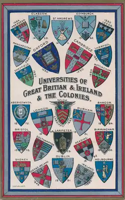 University and college arms often incorporate, or are simply copies of, arms of their founders or local authorities.[2][3][11] At collegiate universities, constituent colleges may bear their own arms, such as at Cambridge and Oxford.[2][3] Many older coats of arms were recorded by Arthur Charles Fox-Davies in The Book of Public Arms in 1915, which also recorded some coats of arms of constituent colleges,[12] and by John Woodward in A Treatise on Ecclesiastical Heraldry in 1894.[13] Most university mottos are not granted with the coats of arms, instead being added by custom by the institution, an exception to this being the arms of Imperial College London.[14] Those universities in Ireland that existed prior to independence from the United Kingdom were granted arms along the lines of other British universities;[15] these are listed separately below.