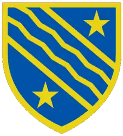 Escutcheon: Azure, within two bendlets, as many bendlets dancettee, all between two mullets Or; a bordure of the last. |