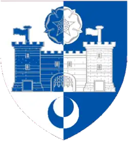 Escutcheon: Per pale Argent and Azure, a castle of two towers flagged each with postern and window, and portcullis raised, all counterchanged, and in chief a rose also counterchanged, and in base a crescent likewise counterchanged. [20] |