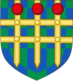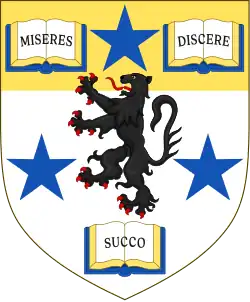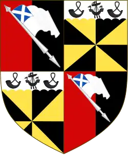 Escutcheon: Argent three Moors' Heads in profile two and one couped Proper wreathed about the temples of the First and Azure Crest: A Demi-lion rampant Argent charged with three Trefoils Vert holding in its dexter paw an Arrow pointing downwards pheoned and flighted Proper shaft Or[13] Motto: Ne cede malis ced contra ("Yield not to misfortunes, but counter them") |