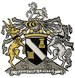 Escutcheon: Sable a Bend between six Escallops Or, and as an honourable augmentation (granted Aug 1906) on the bend in chief on an Escutcheon Vert a Key surmounted by a Baton in saltire Or.