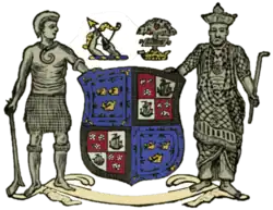 Crests: 1st, two arms from the shoulder naked proper, holding a bent bow or, and in the act of letting fly an arrow proper; 2nd, out of a ducal coronet or, an oak tree, the stem cut transversely by a frame saw, the blade inscribed with the word “Through,” all proper; the body of the tree charged with an escutcheon argent, thereon a heart gules for difference. Supporters: Dexter, a chief of the Fiji Islands, habited, and supporting with the exterior hand a club, all proper; sinister, an Adigar of the Island of Ceylon, habited, and holding in the exterior hand a staff of office, all proper. Motto: Haud Immemor (Not unmindful)[36] |