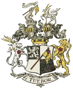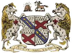 Crest: A Sunflower proper.[20] Coronet: That of a Baron Supporters: Dexter: a Stag proper attired Or collared Gules; Sinister: a Falcon proper jessed belled and beaked Or armed and collared Gules. Motto: Non inferiora secutus (Not following meaner things) |