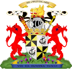Coronet: That of an Earl Crest: A dog's head paly bendy sinister sable and argent, charged on the neck with a crescent for difference. Supporters: Dexter, a lion sable, the paws flayed to the shoulder gules; sinister, a stag proper; both charged on the shoulder with a crescent for difference. Motto: Fearless and faithful[21] |