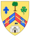 Escutcheon: Or on a chevron paly Azure and Gules of eight pieces charged with two swords Or between a fleur-de-lys Azure in dexter, trefoil Vert in sinister and in base the gate of the Citadel of Quebec surmounted by the standard of the Governor General of Canada proper; in chief an oak tree proper.