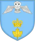 Escutcheon: Bleu Céleste in chief an owl affronty hovering Argent in base a maple leaf ensigned by the Royal Crown both Or.[26] | ||